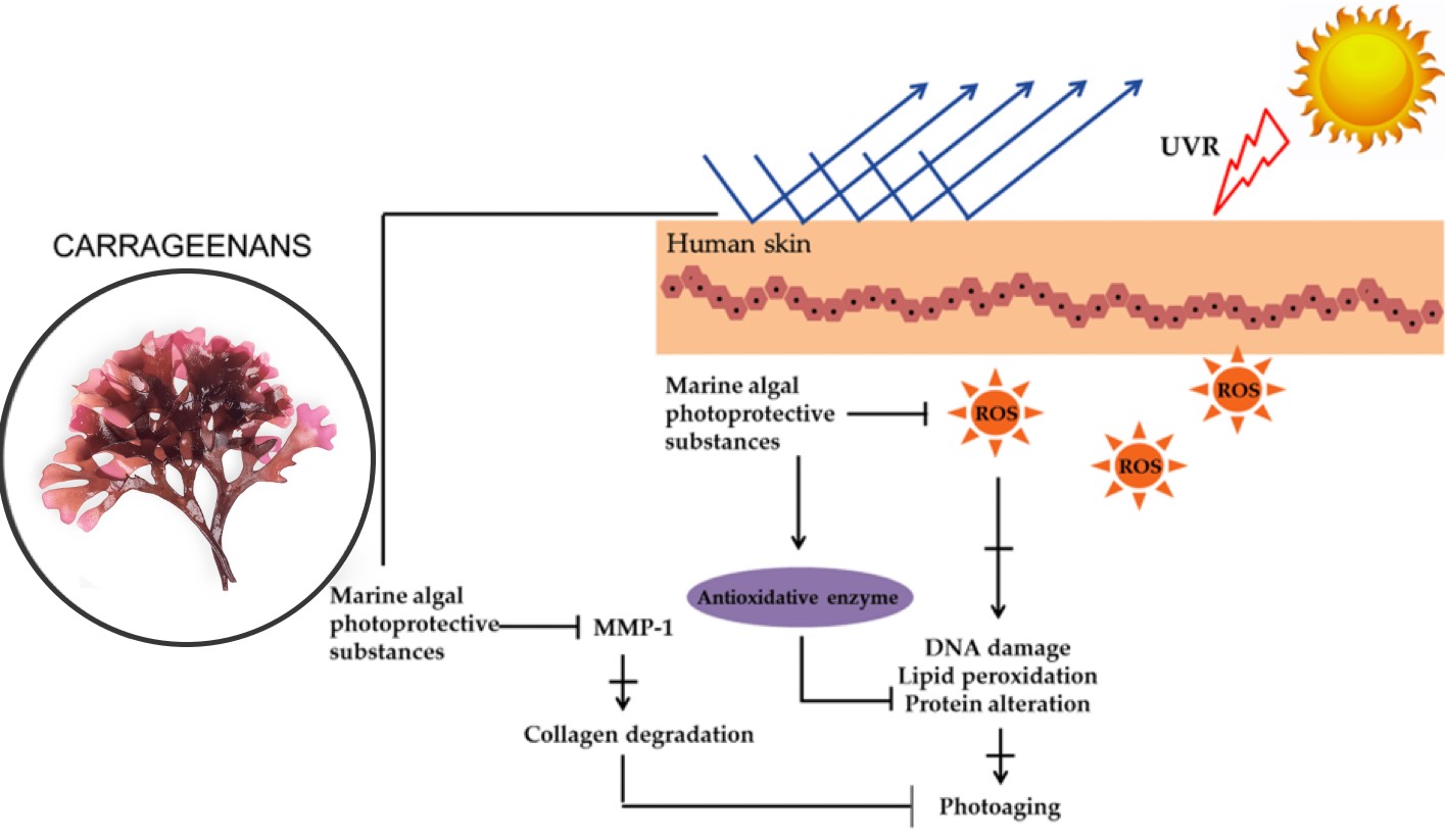 Carrageenan has shown significant protection against the detrimental effects of UVB-induced apoptosis in HaCaT cells and has decreased the release of reactive oxygen species (ROS). The accumulation of excess ROS has been related to skin diseases including skin aging and cancers.