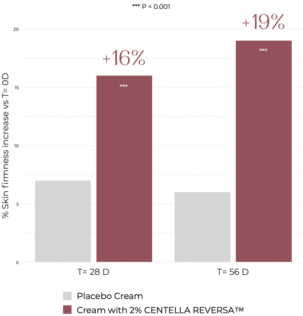 Centella Reversa™ significantly increased the skin firmness at 28 and 56 days by up to 36% and 46% respectively compared to DO