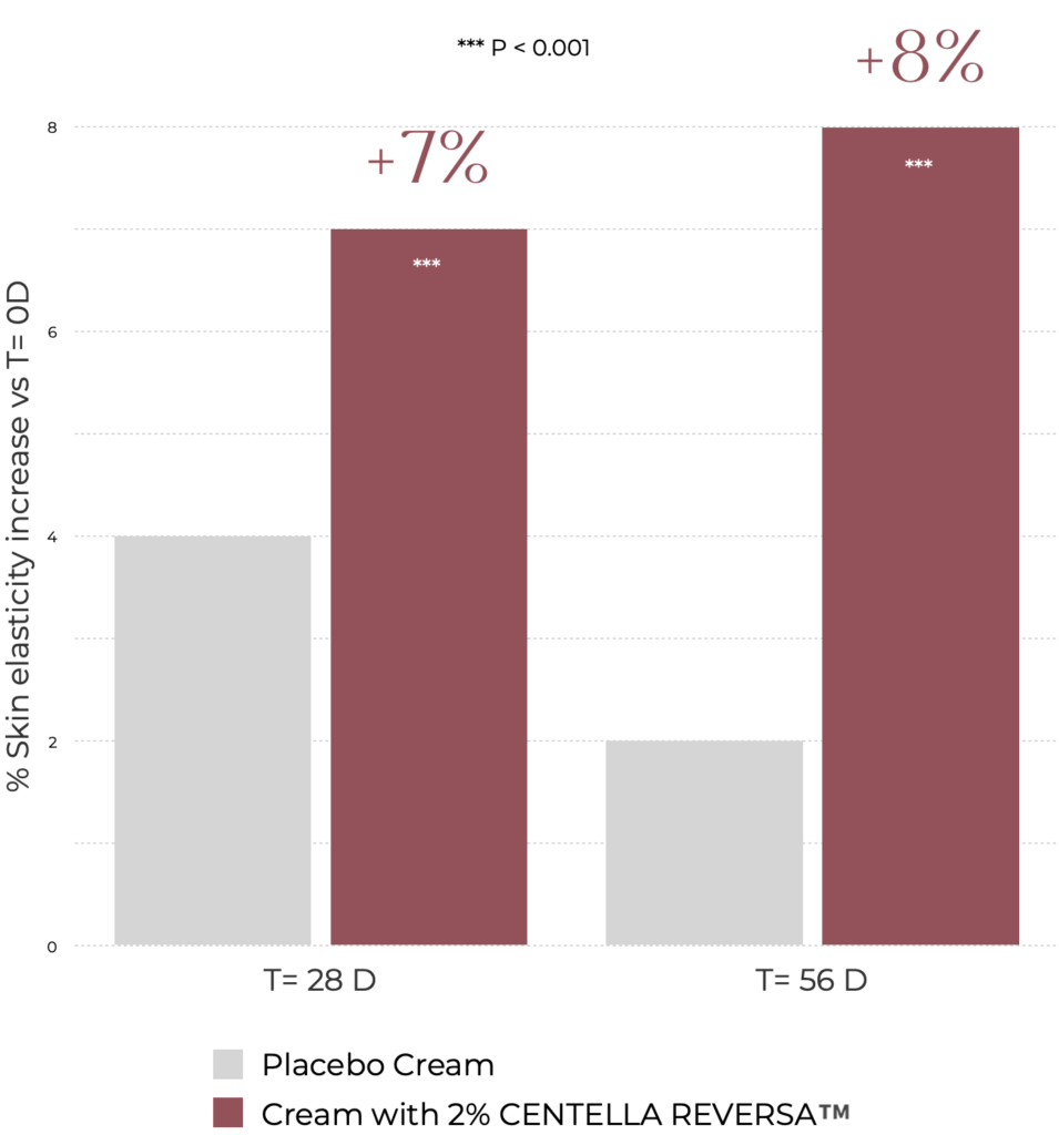 Centella Reversa™ significantly increased the skin elasticity at 28 and 56 days by up to 21% compared to DO